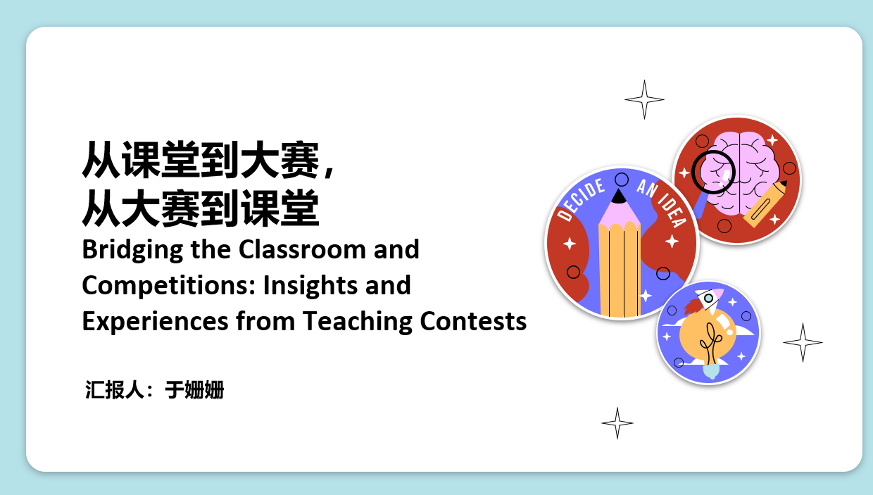 于姗姗老师从“外教社杯”全国高校外语教学大赛简介、国赛赛程及赛后反思三个方面,结合从课堂到大赛,再从大赛到课堂的经验与收获,与与会教师进行了细致分享。