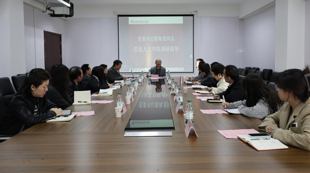近日,学院党委书记梁海龙深入人文学院调研指导,就加强党的建设、提高教育教学水平、提升人才培养质量,以及人文学院未来建设与发展进行座谈交流。党委办公室主任支玉成陪同调研,人文学院领导班子、各系主任、教研室主任参加了座谈交流。