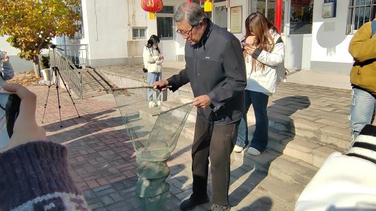 东走线窝村已有800多年的历史,文化积淀丰富。因沿河而居,村民们就地取材,将河滩上的芦苇用麻绳精心编织成箔,并在水边扎成密封圈,布阵捕鱼。这一传统方法不仅展现了村民们的勤劳与智慧,也带来了丰硕的收获。作为扎箔布阵捕鱼技能的第五代传人,村民李连贵对这项技艺有着深厚的感情和独到的见解。他通过手绘各种布阵图,向师生们介绍这一传承已久的捕鱼技艺,同时也向大家展示各类渔网工具,带领师生们感受渔家生活的变迁与传承。