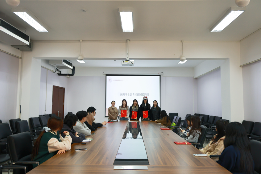 会议尾声,汪晓薇老师和焦鑫睿老师为记者团学生团长王嘉祺颁发聘书,为学生副团长巩令姝、李欣霖、王省懿颁发聘书,为优秀干事王省懿、王莉、胡佳琪三位同学颁发荣誉证书。