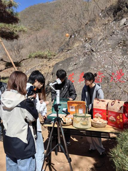 活动期间,“麻酱拌香菜”和“禾作hi~”两个学生创业团队以桃花诗会和新水场村鸡蛋产业为主题,开展近120分钟的现场助农直播。直播吸引300余位观众在线互动,收获8500+点赞,成功为当地农产品打开数字化销售渠道。这场直播不仅传播了桃花诗会的热闹氛围,更通过新媒体技术将乡村经济与消费者需求直接对接,探索出“内容传播+电商带货”的乡村振兴新模式。除直播外,其他同学分组创作短视频和互动H5作品。他们用镜头捕捉桃花娇艳、活动精彩瞬间以及乡村自然人文风光,形成一系列具有传播价值的数字内容。优秀作品将被推荐至主流媒体平台,为蓟州乡村文旅打造可持续传播的数字资产,突破传统旅游营销的时间空间限制。
