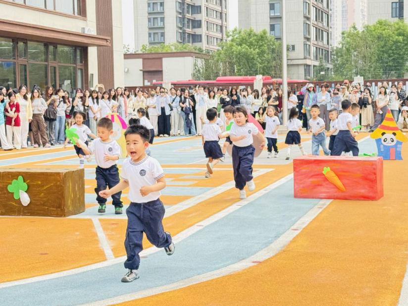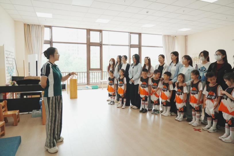 在实践观摩环节,学生们分组开展沉浸式学习。户外活动中,大班幼儿的“篮球操”表演将运动技能与艺术表现融为一体,小班幼儿的主题体育课程则通过情境化游戏激发幼儿协作能力。幼儿们的天真与活力感染了现场的所有观众,同时一线教师灵活的教学策略也令学生们深受启发。