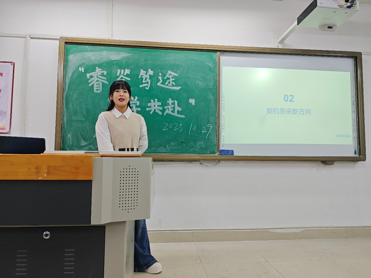 分享会上,赵金田学姐以自身十年职场历程,讲述了从大四随波逐流备考考研,到不再以此为由逃避社会、转战职场的蜕变之路。她从兼职起步,凭借不懈坚持逐步成长为新东方助教、主讲老师,进而晋升为带领五十余名教师的主管。面对政策转型,她另谋出路进入静文中学。凭借先前的经验与积淀,她仅用一年多时间成为了骨干。她的十年,是自我觉醒的十年,是持续成长的十年,更是用努力和付出书写“破局者”故事的十年——只要敢于觉醒、勇于行动,每一次转身都能成为人生新的起跳点。她的经历给正处于迷茫的同学们带来了新的方向,也鼓舞着大家坚定自己的目标和梦想。