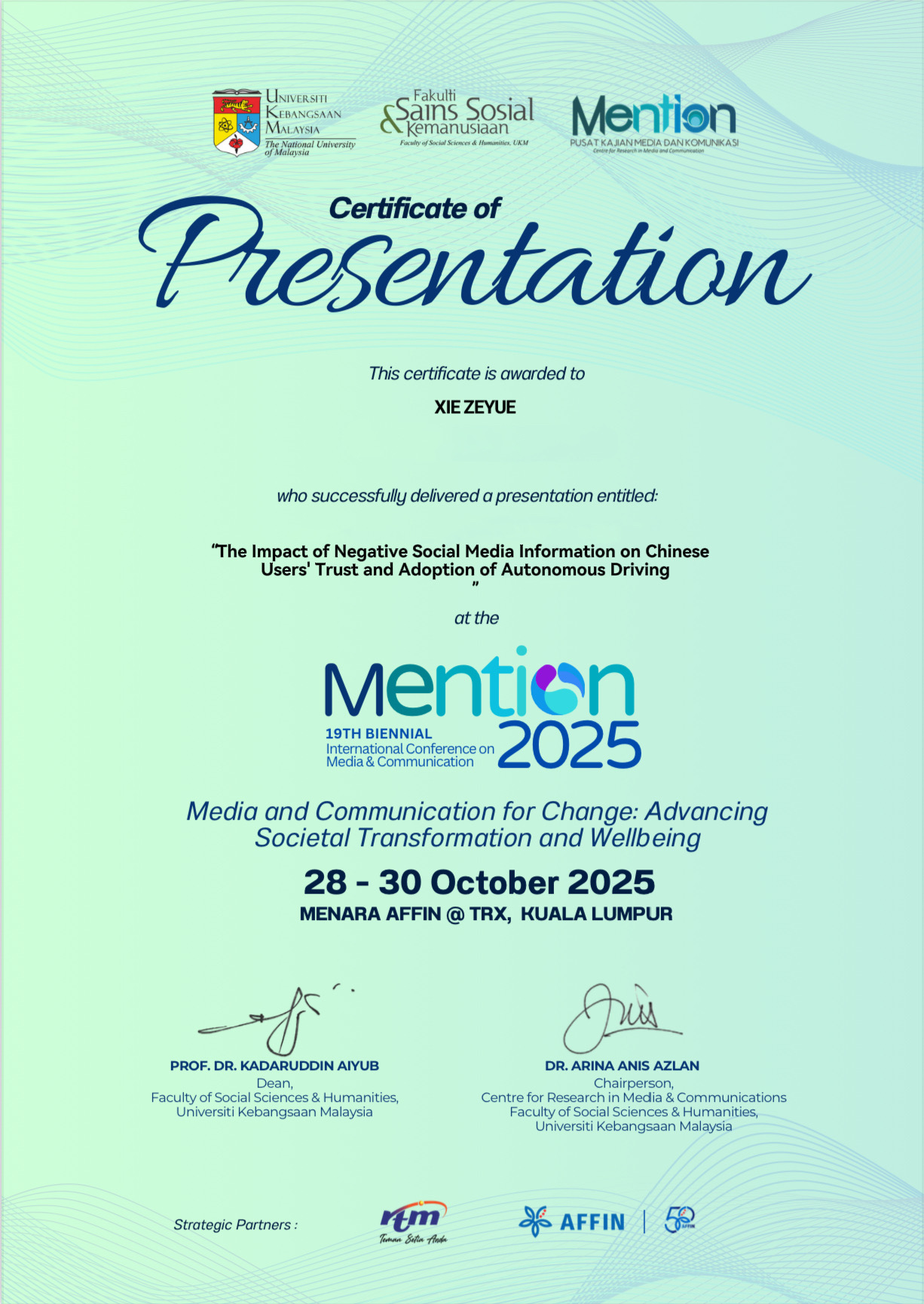 10月28-30日,第19届《国际媒体与传播会议(MENTION2025)》在马来西亚吉隆坡隆重举行。人文学院教师谢择月受邀出席此次会议并作题《The Impact of Negative Social Media Information on Chinese Users' Trust and Adoption of Autonomous Driving》(负面媒体对中国用户信任和接受自动驾驶技术的影响)的学术发言。