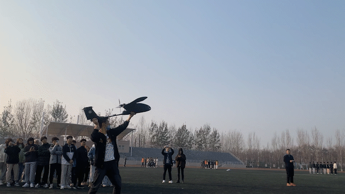 在无人机实飞环节,孙传宇老师通过电脑操作展示了飞马V1000的垂直起降、航线规划飞行等过程。邵阳老师亲自操作了其他三架旋翼机,并向同学们实操讲解了难度较高的无人机手抛飞行。李琦同学还操纵航拍无人机对实飞环节四架无人机的起飞过程进行了跟踪观察记录。