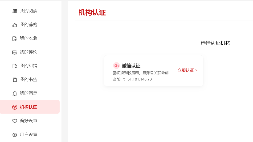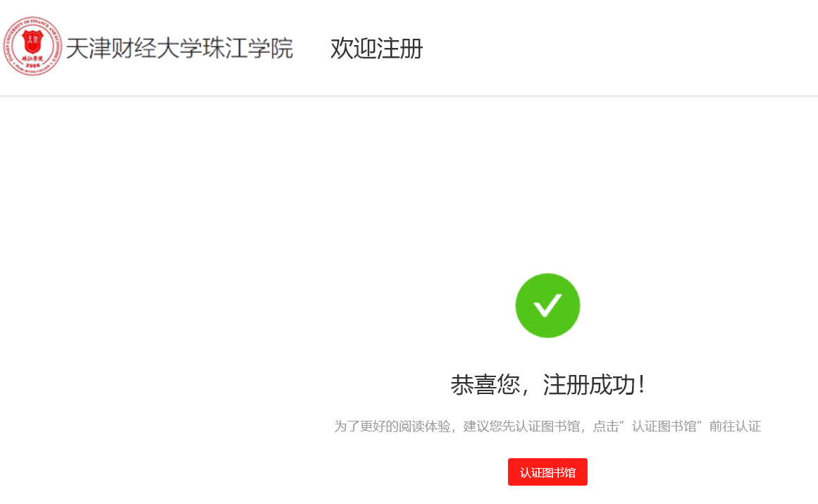 2、登录后点击右上角注册,根据提示操作,注册成功后点击“认证图书馆”,如下图: