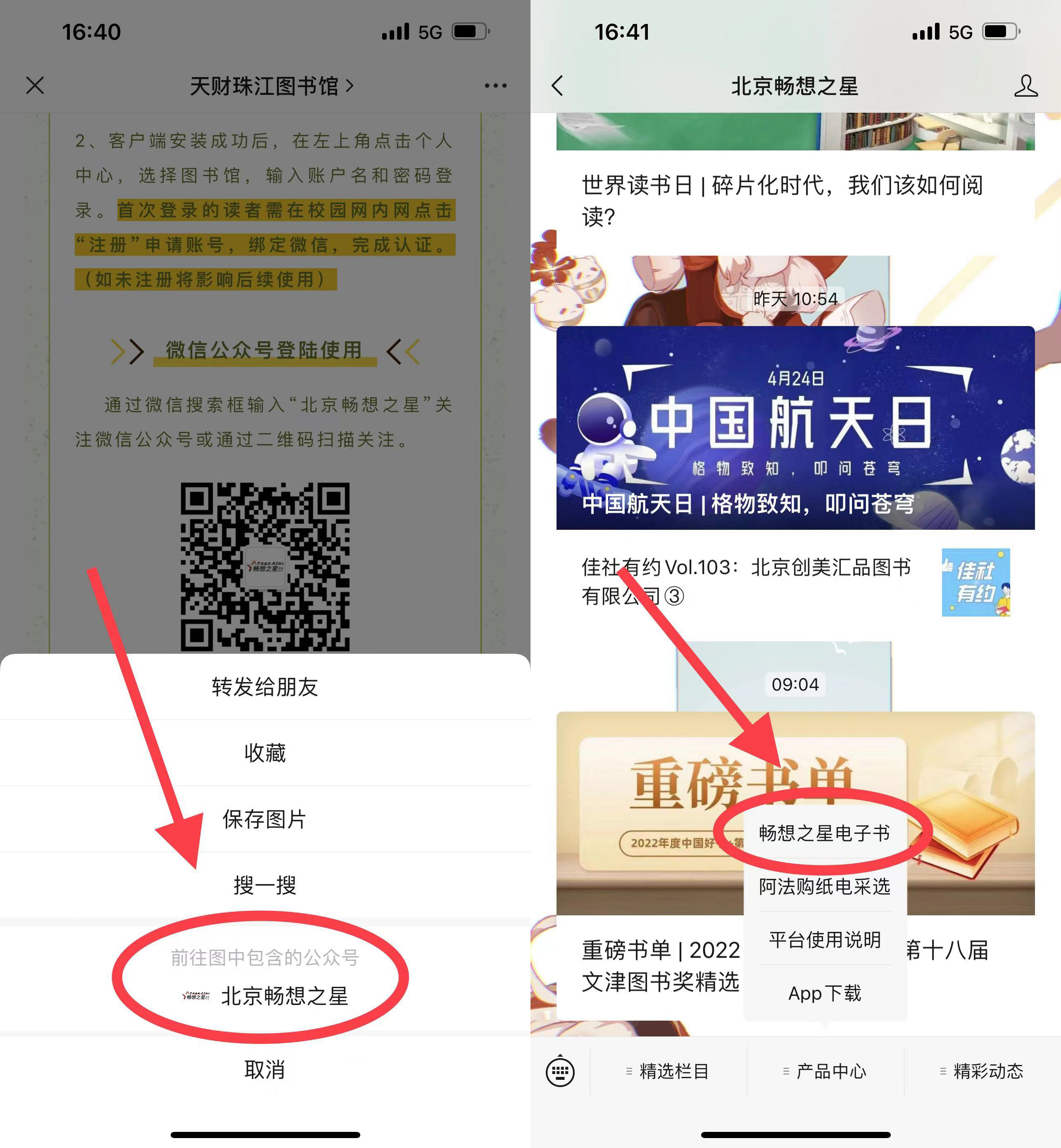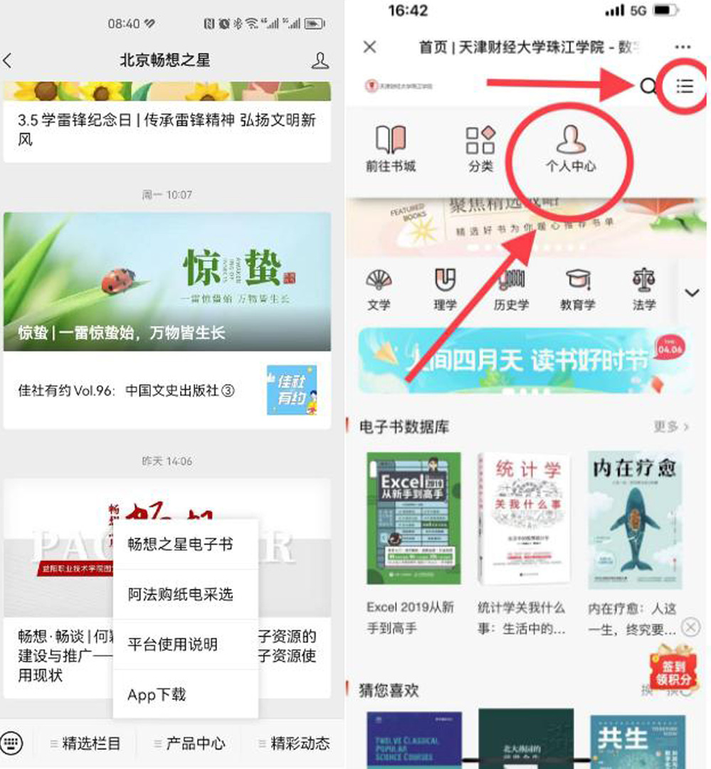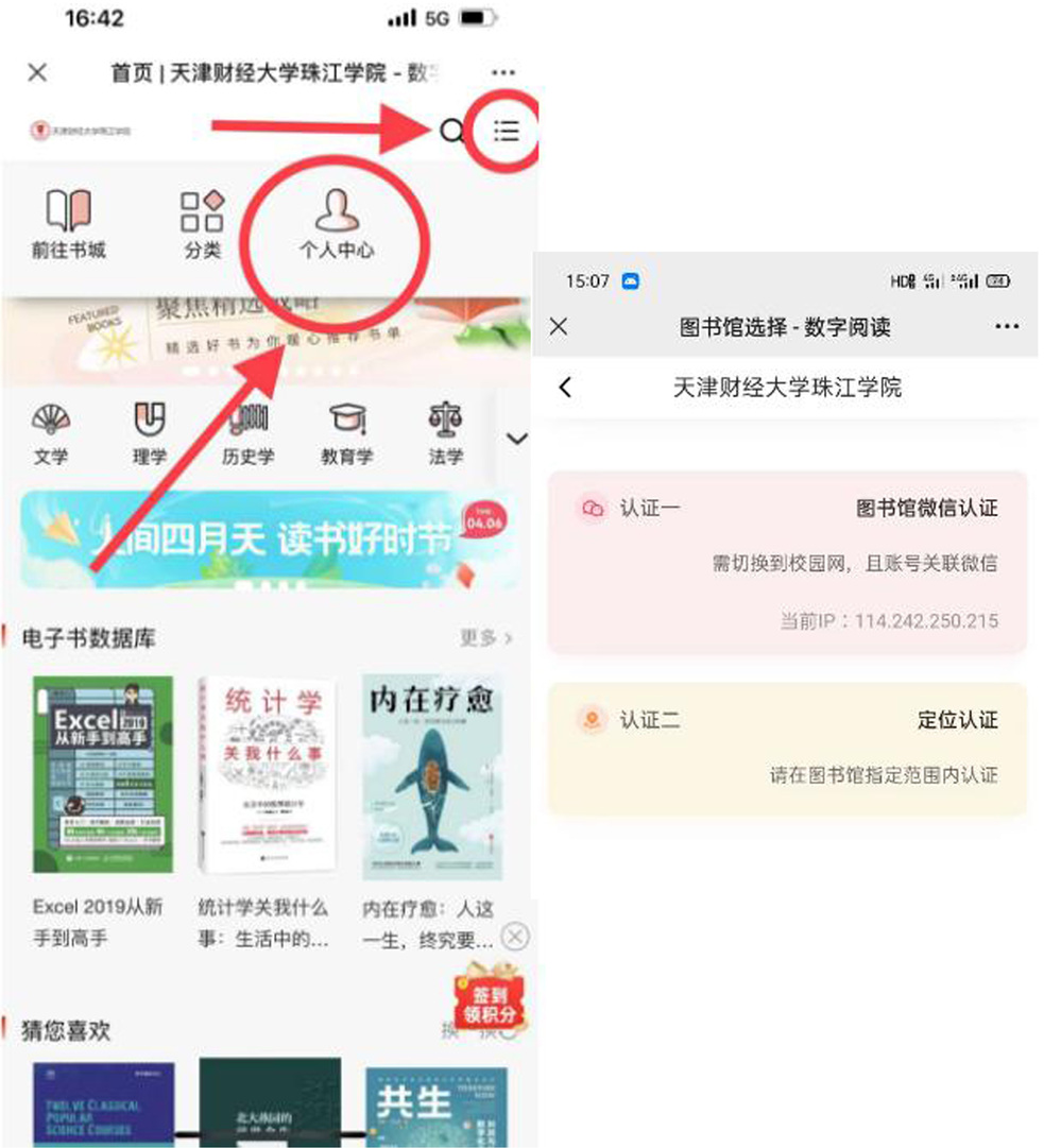 2、进入图书微信公众号,点击右下角“资源介绍”——“畅想之星电子书”——扫码进入——“产品中心”——“畅想之星电子书”——点击右上角,在个人中心完成注册即可阅读,新登录账号需在校园网内网完成注册,或以“定位认证”方式完成认证。认证有效期为三个月,三个月后需重新认证,否则无法在校外使用。