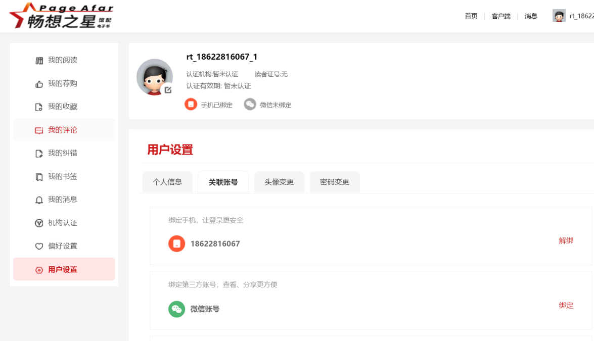 点击左侧“用户设置”——“关联账号”——“微信账号”——“绑定”,如下图: