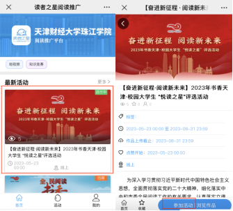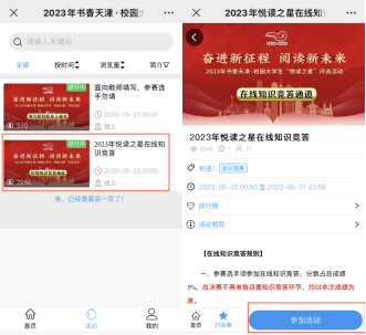 2、参赛选手关注“书香天津”微信公众号,选择“品牌活动-推广平台”栏目,进入“2023悦读之星在线知识竞答”即可参加。