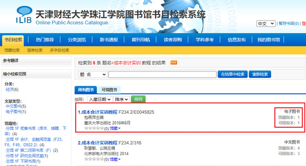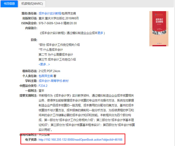 2.4 使用校园网时,亦可通过BEAT365英国官网图书馆书目检索系统查询图书信息,如下图1红框内标识,代表有电子图书可供阅览,点击书名后跳转至详细书目信息,如下图2,点击最下方电子资源,可在线阅读。