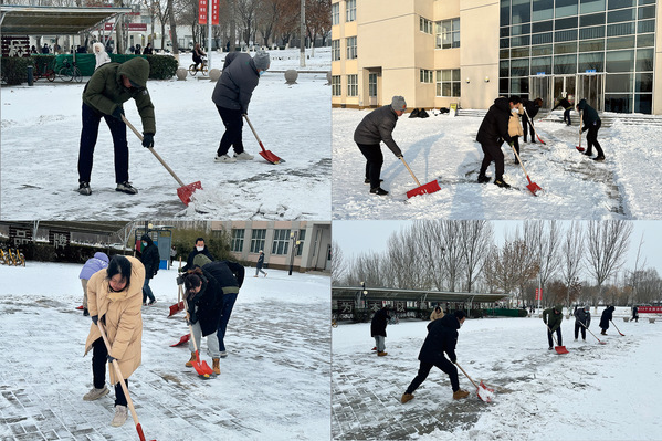 厚重的冰雪给清理工作带来困难,但大家不畏辛苦,干劲十足,相互配合,齐心协力。经过几个小时的清理,图书馆门前扫出一条宽敞的道路,为师生进出图书馆提供便利。