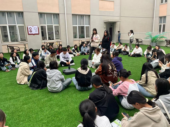 其中,英语角主题活动中,主持人用英语向大家介绍了国庆节的由来和相关的符号和意象,同学们介绍了自己国庆七日假期见闻,彼此积极互动交流。还前往露台草坪进行了游戏互动,整体氛围轻松活泼。读书会活动中,图书馆老师先对写作方式方法进行了介绍指导,后又带领同学们写下对祖国的祝福和感恩,表达了对祖国的崇高敬意。