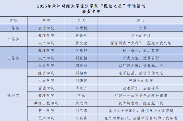 本次悦读之星演讲比赛以“诵读红色经典,弘扬中国精神”为主题,为纪念中国人民抗日战争暨世界反法西斯战争胜利80周年,由图书馆与政治理论课部联合策划。比赛中,各二级学院精心推荐、政治理论课部选拔推优及图书馆定向培养的13名选手,结合自身经历从不同角度分享了在红色经典书籍中获得的深刻感悟。感人的话语、真挚的情感充分展现出,青年学子奋力书写为中国式现代化挺膺担当的青春篇章。整场评选高潮迭起、精彩纷呈。最终经评选,来自会计学院李雨桐获得一等奖,管理学院包语欣、人文学院黄文萱获得二等奖,管理学院侯慧轩、人文学院刘佳怡、会计学院郭维赫获得三等奖。