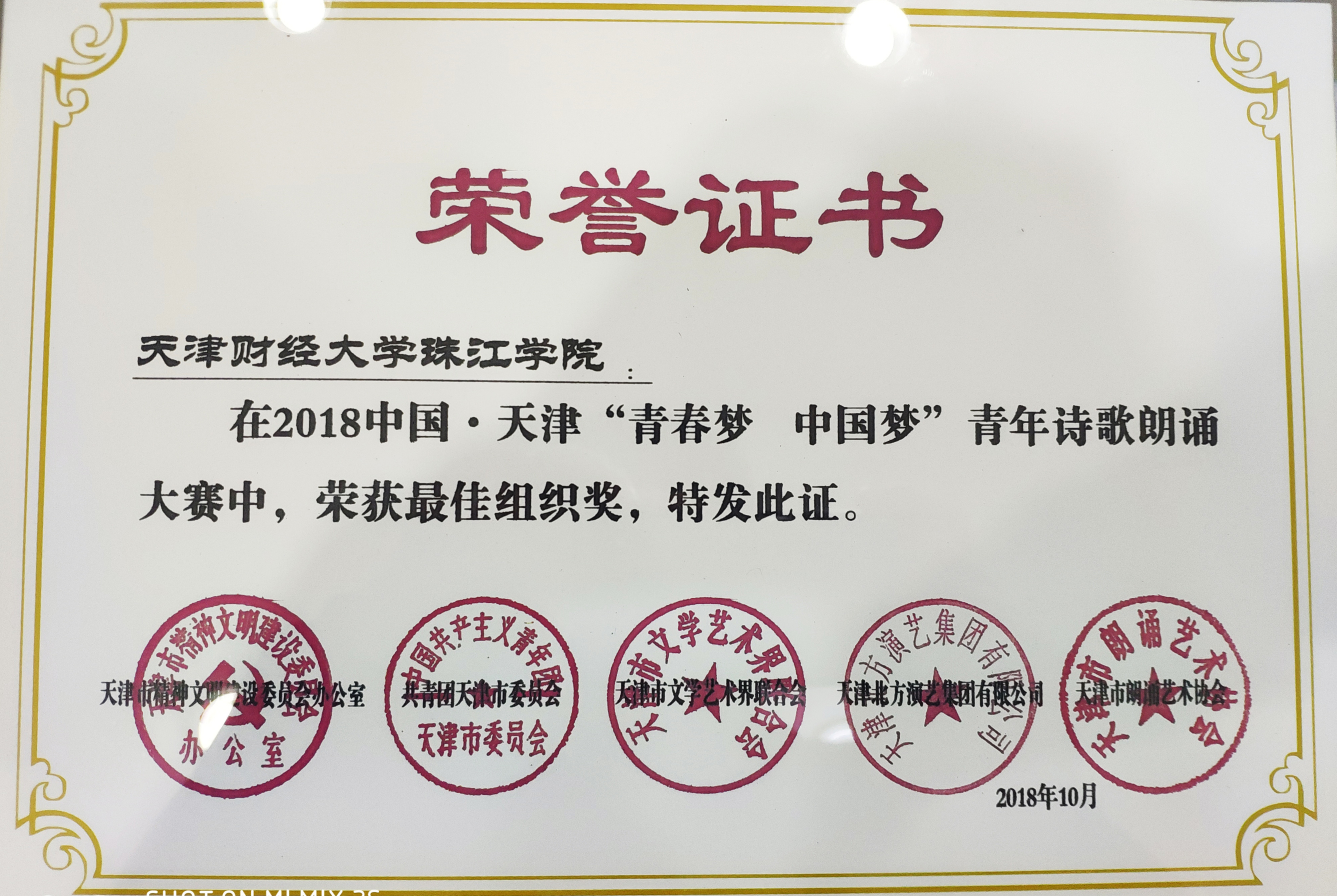 为喜迎改革开放40周年,由天津市精神文明建设委员会办公室、共青团天津市委员会、天津市文学艺术界联合会、北方演艺集团主办,天津青年友好使者艺术团、天津青年宫、天津市音乐家协会、天津广播电视台音乐广播联合承办的2018中国•天津“放歌新时代”青年歌曲演唱大赛、“青春梦 中国梦”青年诗歌朗诵大赛、“青春放歌新时代” 校园合唱大赛于近期圆满落幕。我院在青年歌曲演唱大赛和青年诗歌朗诵大赛中获得最佳组织奖,学院大学生合唱团参赛作品在校园合唱大赛中荣获三等奖。