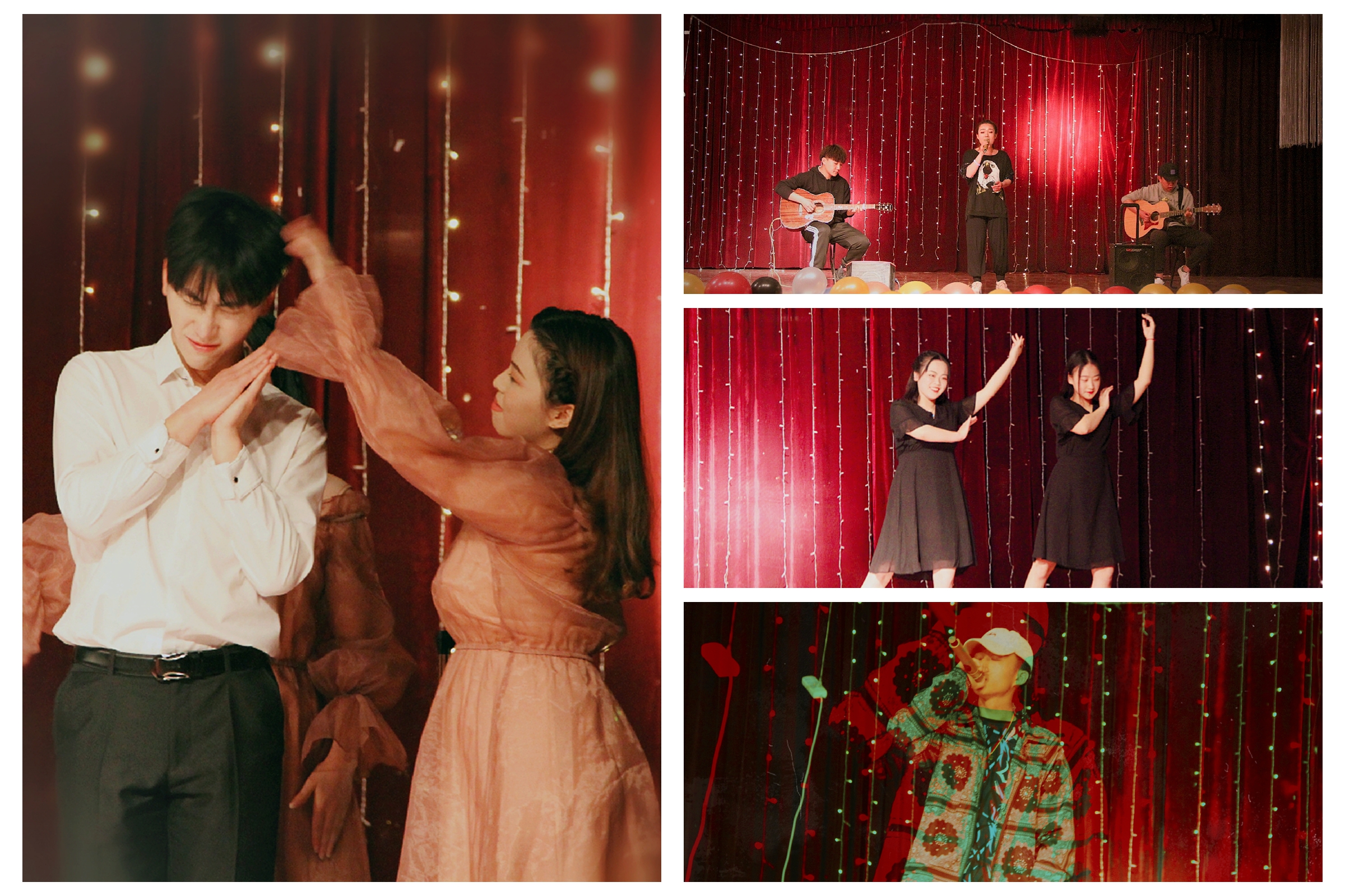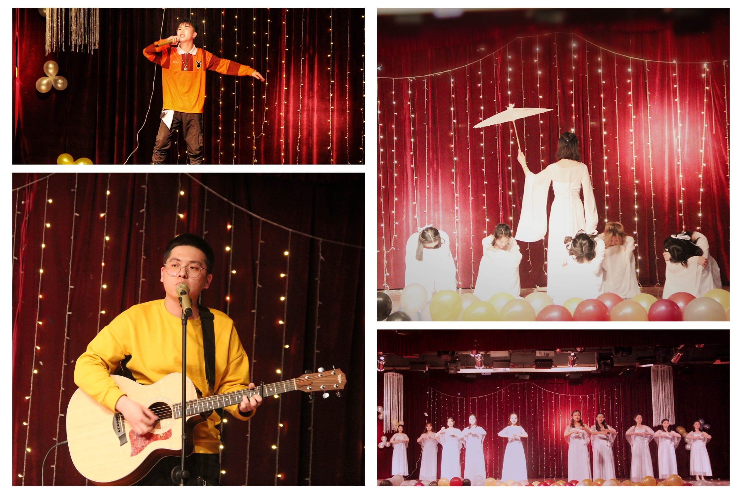 B-BOX社的郝宇慧、杨浩然带来的《飘向北方》炸裂全场。B-BOX社的杨文文、吴兆子带来的《目不转睛》在脑海里绕梁三日。交谊舞社带来的精彩舞姿《忘了爱》如四月的花蕾飘摇在青春的枝头。吉他社的陈好、巫浩威、崔博闻带来的《shape of you》展现出努力做自己是真招人喜欢的那股特立独行的劲。手语舞社表演《房间》后则是第一个互动环节。古风类曲《招揺知否红墙叹相忘》将观众带回到历史中。听到《儿时》,脑中忽然浮现木心先生笔下的女孩和男孩。《侧脸》走过一段又一段说“你好”和“再见”的路程。《我只有一把木吉他》后的《姑娘》则是最后的结尾。