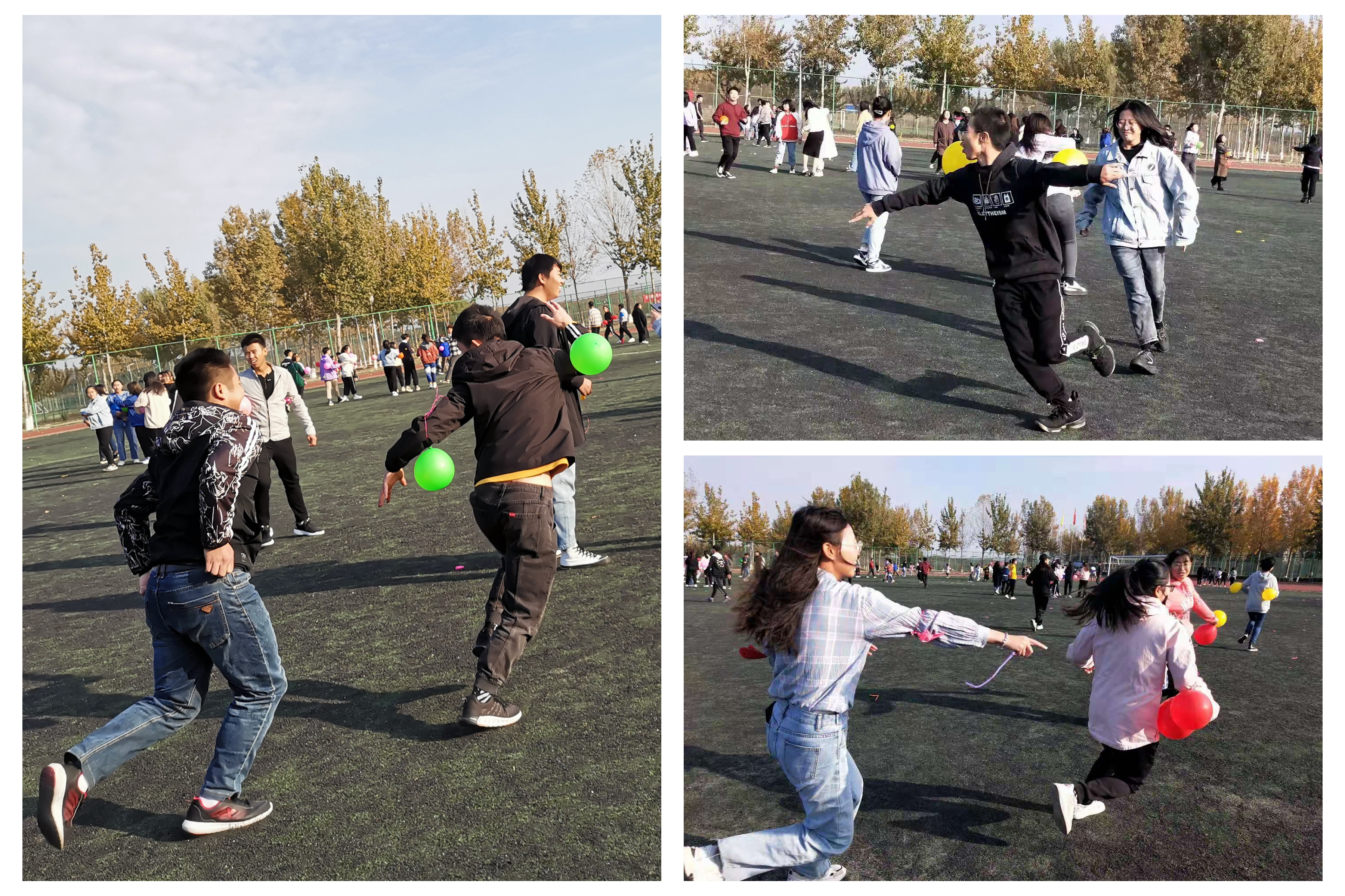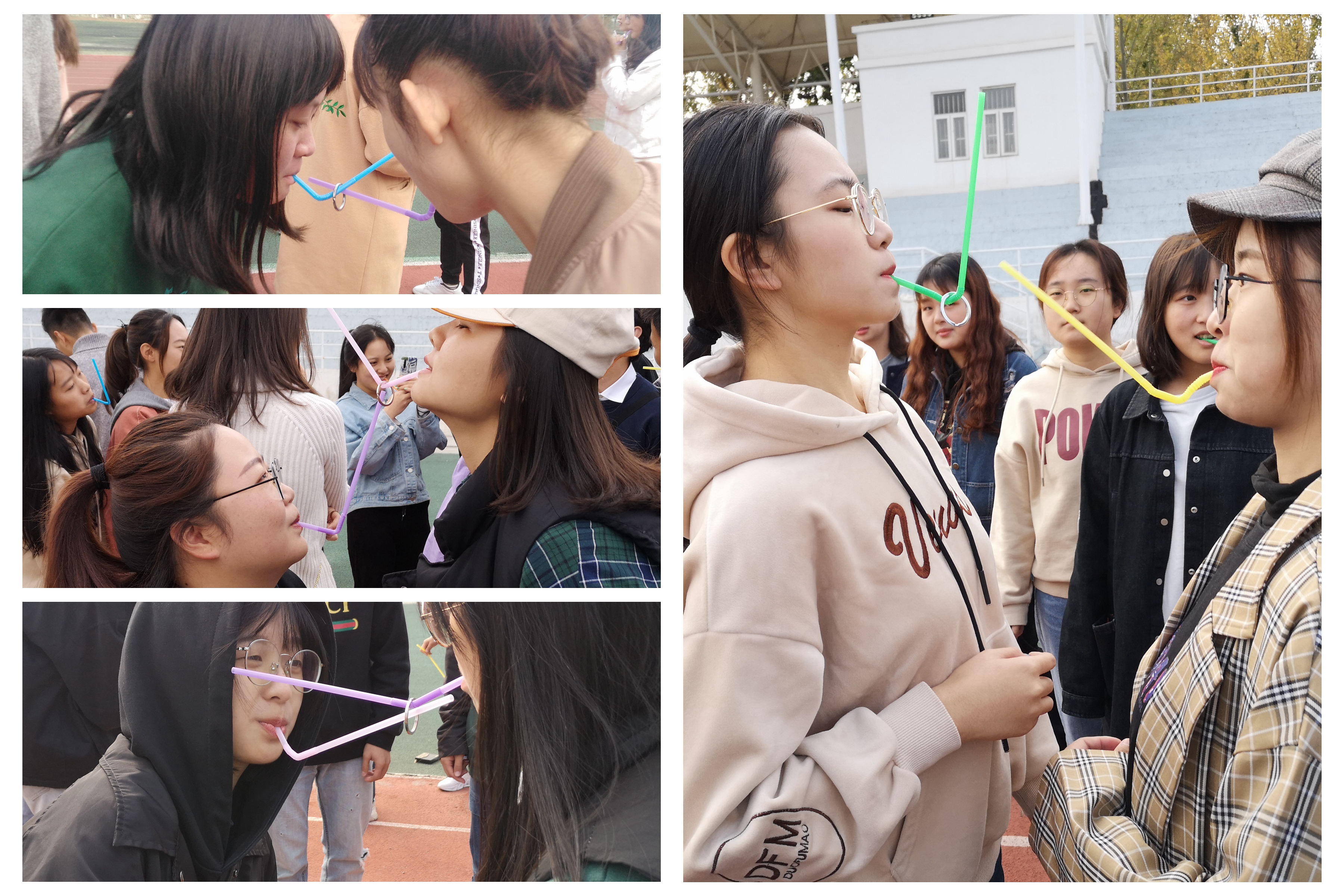 素质拓展活动包括呼啦圈传递、吸管运输、“坐长城”、气球大战。呼啦圈传递要求队员围成一个圆圈,通过不停的上下摇摆将自己从呼啦圈里面解脱出来再将下一个同学套进去,它要求3名同学的默契配合。吸管运输游戏环节中队员排成一列,用嘴叼着吸管传递钥匙圈,一会儿蹲下,一会儿起来,一会儿左摇一会儿右摆,可谓乐趣无穷。坐长城才最耗费体力,所有队员围成一圈站立, “坐下”的声音一旦响起,前面的队员就要立刻坐在后边的队员膝盖上,即使再精疲力竭,也要坚持,这是对参赛者个人毅力的考验。最后是气球大战,在胳膊上绑两个气球,互相干扰让对方队员的气球爆掉,剩余气球数最多的为胜者。一眼望去操场上都是奔跑的气球,它拉近了各部门成员间的距离。社联部获得本次活动的第一名,宣传部获得第二名,信息部获得第三名。