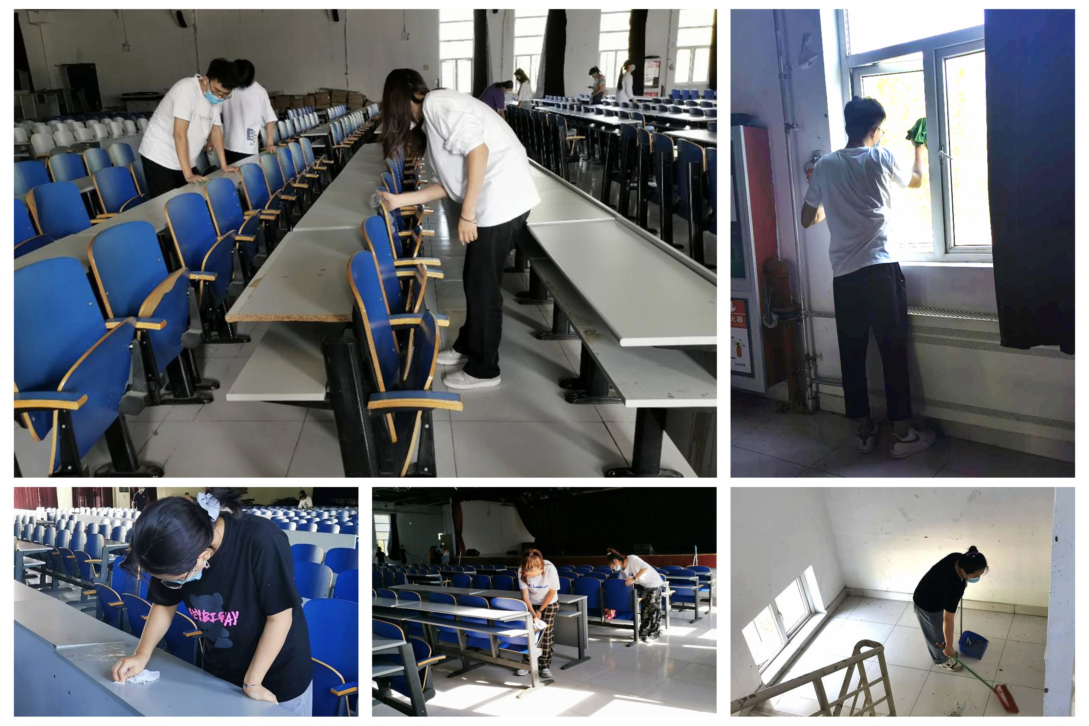 疫情期间,素质教育中心作为整合校内外资源,面对学生进行素质教育培训,实现学生、教师和社会三方面互动的一所无形学院,卫生问题不容忽视。志愿者通过志愿汇APP报名参加活动,30名志愿者清洁素教二楼表演场地,其余志愿者打扫一楼办公室和培训室。虽然正值夏季的尾巴,天气依然酷热难耐,但志愿者没有被火辣辣的太阳吓住,个个戴着口罩干得热火朝天。有的男同学甩开臂膀三个一伙、五个一群,把堆放在二楼的闲置办公桌椅分门别类再依次抬到墙边归置好。其他的志愿者也都自带抹布对观众席座椅、走廊、楼梯间、窗户、旮旯死角彻底清扫。除了清洁,志愿者还将一楼办公室的各种学生文件分类整理,并把培训室的乐器擦拭干净迎接新生的到来。经过他们的辛勤劳动,素质教育中心重现昔日风采。