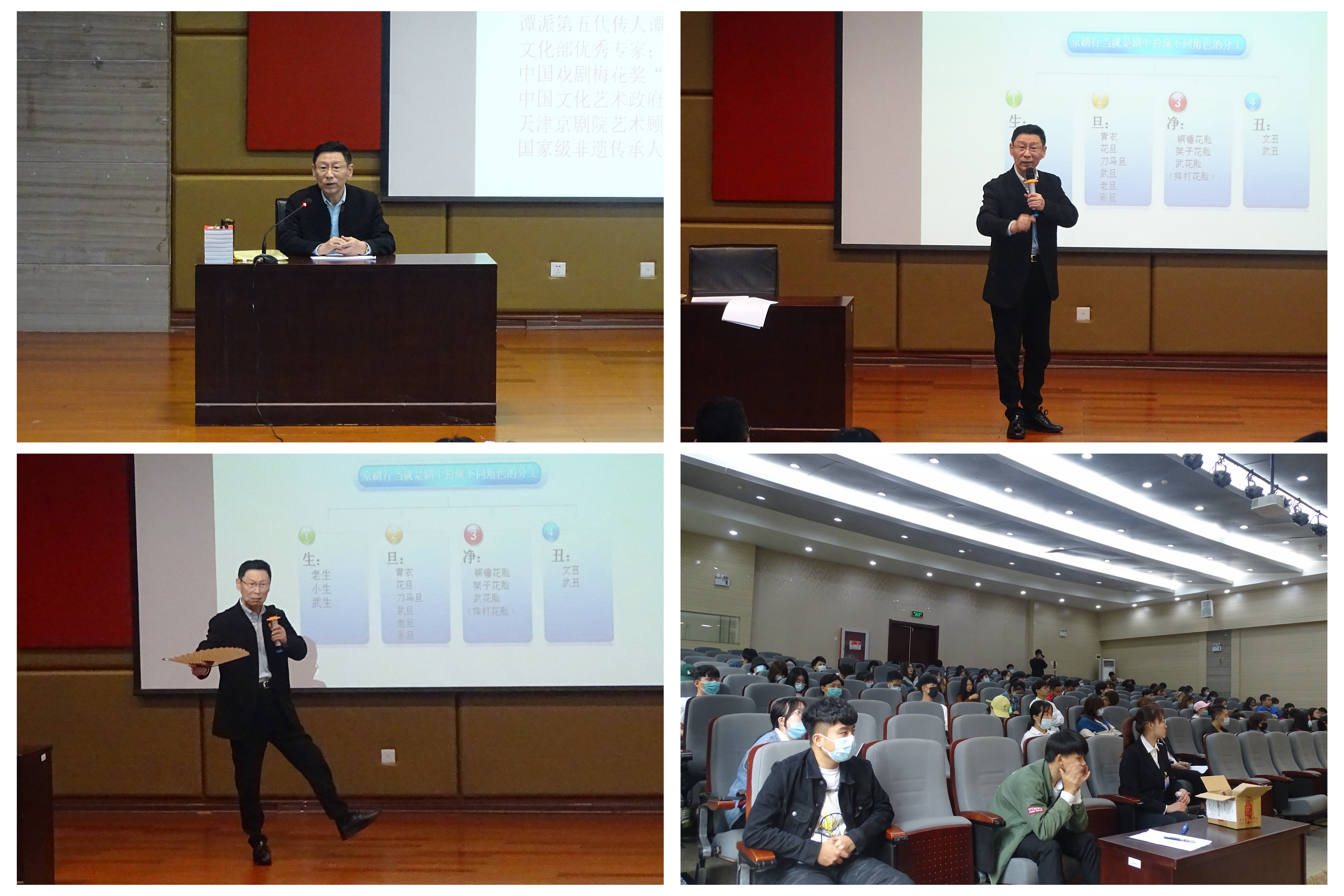 王平老师围绕“普及京剧知识”“创新传承发展”主题展开讲座,理论讲授与现场表演相结合。在表演方面,他认为应注重塑造人物精神气质,善于运用武技绝活;在创新方面,他坚持要讲究“移步不换形”,不盲目创新,丢掉戏曲本质的东西;在传承方面,他强调了勤学苦练的重要性:一天不练自己知道,两天不练同行知道,三天不练观众知道。为了让同学们更深刻地感受京剧魅力,王平老师现场表演解疑答惑,他醇厚的唱腔,娴熟的动作,引得台下师生掌声不绝、叫好声不断。同时,我院戏曲社同学们登台献唱,王平老师进行耐心细致讲解与点评,讲座结束后,同学们表示收获颇丰,纷纷与王平老师合影留念。