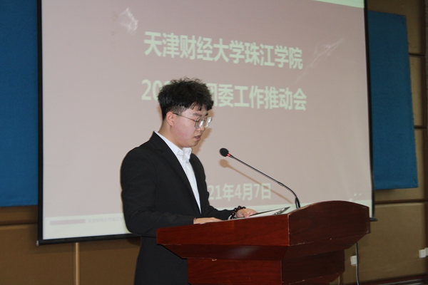 会上,首先由院学生会主席刘恒、青协主席李汇娟、艺术团主席罗鹏、团委宣传部主席徐圣涵依次上台做工作总结和工作计划。接下来,由院学生会部长代表杜珺、青协干事代表杨萍、艺术团干事刘美新依次上台发言,分享学生组织工作经验及收获。会议最后,团委书记周圆作了工作部署。周书记首先向参会人员详细讲解了2021年团委的工作要点及重点工作;其次就团委老师及工作分工做了介绍;最后周书记对共青团工作进行了解读,就如何成为一名优秀学生干部指明了方向。