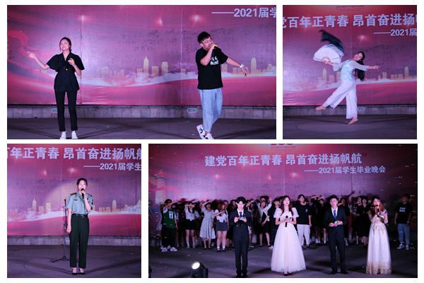 2021年6月23日19:30,由学院团委主办的“建党百年正青春 昂首奋进扬帆航”2021届学生毕业晚会在文化广场举行。学院纪委书记白晓、党委副书记王猛出席活动,近1000名学生观看演出,火爆的现场激发了学生们参演的热情。学生们将精心编排的节目搬上舞台,用歌舞、朗诵、相声的方式献礼建党百年,惜别学长学姐,祝福全体毕业生。