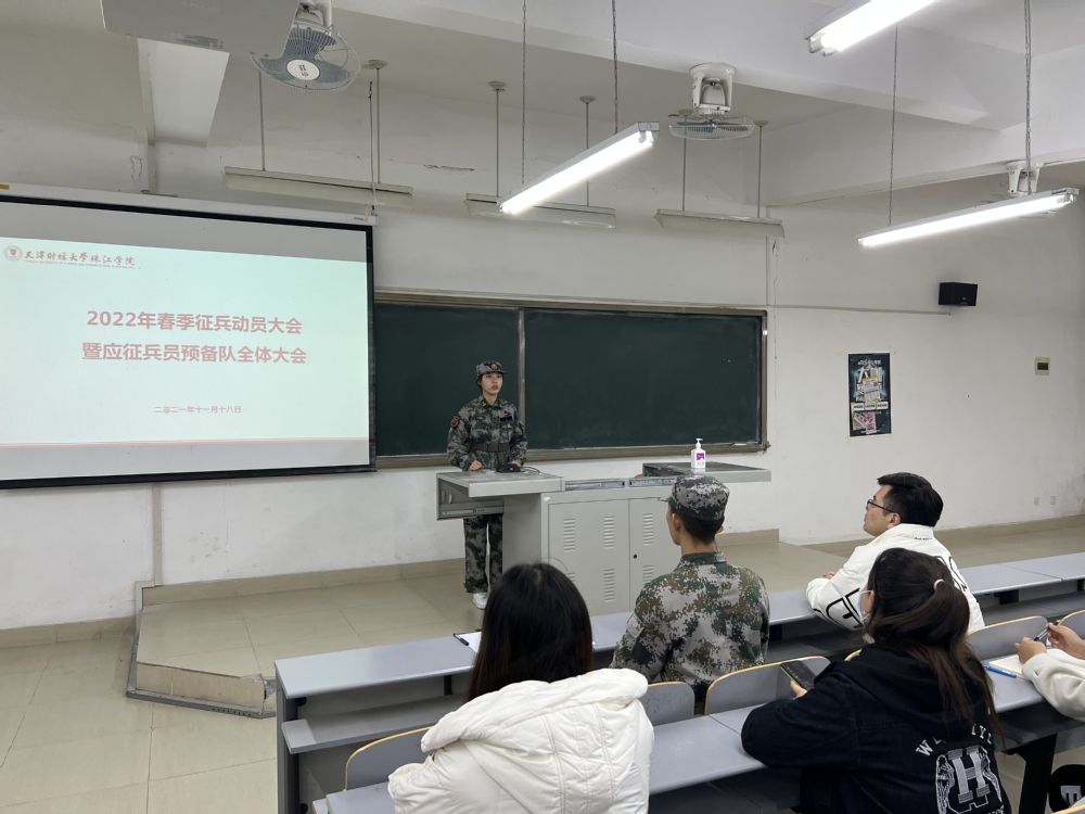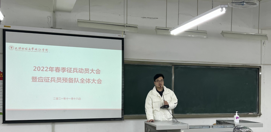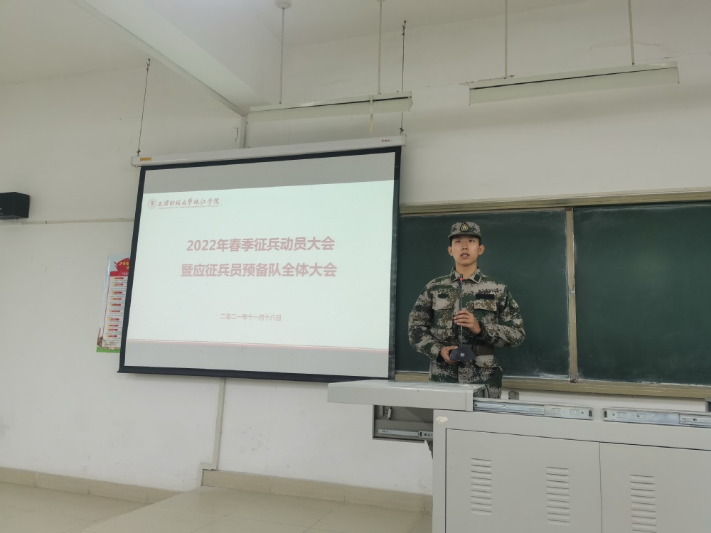 20211118日,学院2022年春季学生征兵动员大会暨应征兵员预备队全体大会在新上善109召开,应征兵员预备队全体队员及意向参军入伍的学生代表共90余名同学参加,会议由应征兵员预备队教导员周奕杉主持。