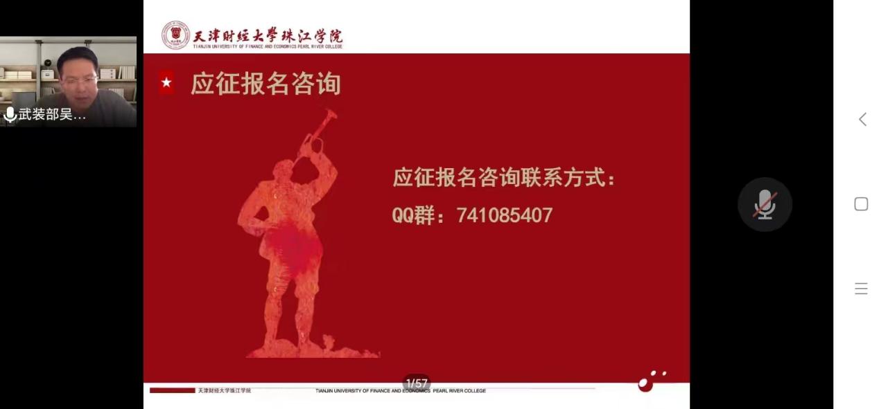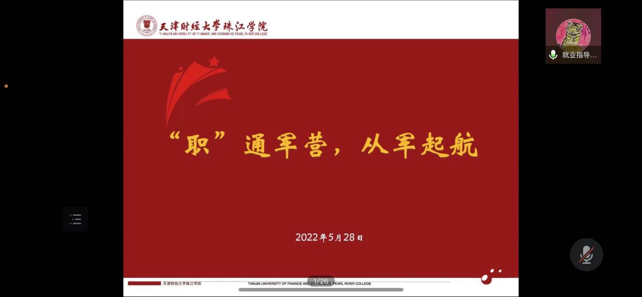 按照市教委关于开展毕业生就业创业政策宣讲的文件精神和市教委、警备区2022年征兵工作要求,5月28日上午,学院武装部与招生就业办公室在线上进行了2022届毕业年级“‘职’通军营,从军起航”专题就业政策宣讲。学院武装部、招生就业办公室就业指导中心、各二级学院相关辅导员、意向参军的毕业生共计200余人参加,武装部部长吴亚娟主持。