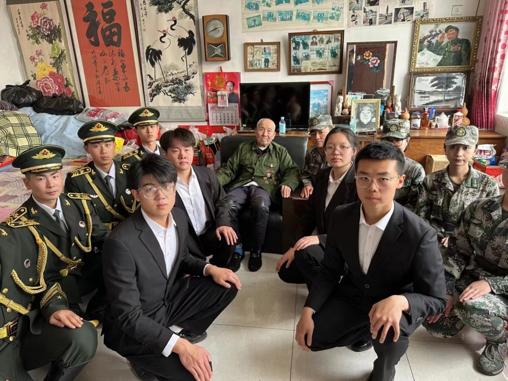 高永太1927年生,1947年入伍,1947年入党,参加过辽沈战役、平津战役、渡江战役和抗美援朝战争。队员们首先听取了村委会支部书记李印亮和高永太孙子高为宁对老人基本情况的介绍,并自发为其打扫屋子及院落。随后,队员们围坐在革命老兵的身边,聆听老人讲述战争年代敢于战斗不怕牺牲的故事,共同回忆往昔峥嵘岁月,思忆战友时老人流下了真情的眼泪。听完老兵的讲述,队员们为革命老兵展示我院学生教导队的日常训练装备、训练科目,陪同老人观看学生教导队训练和军训成果视频,展现了珠江学子朝气蓬勃的青春风采。老人感慨地说:“感谢同学们来看我,我岁数大了,好多事情记不清楚了,但是请你们相信,我的革命信仰永不变!你们一定要珍惜今天的幸福生活,立志将来为国家多做贡献。”