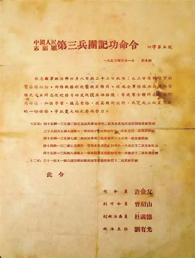1953年6月1日,中国人民志愿军第三兵团记功命令。