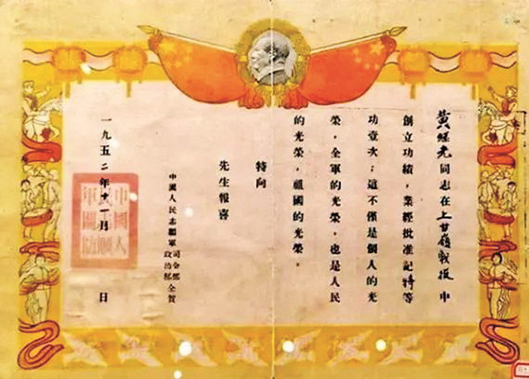 黄继光特等功奖状。