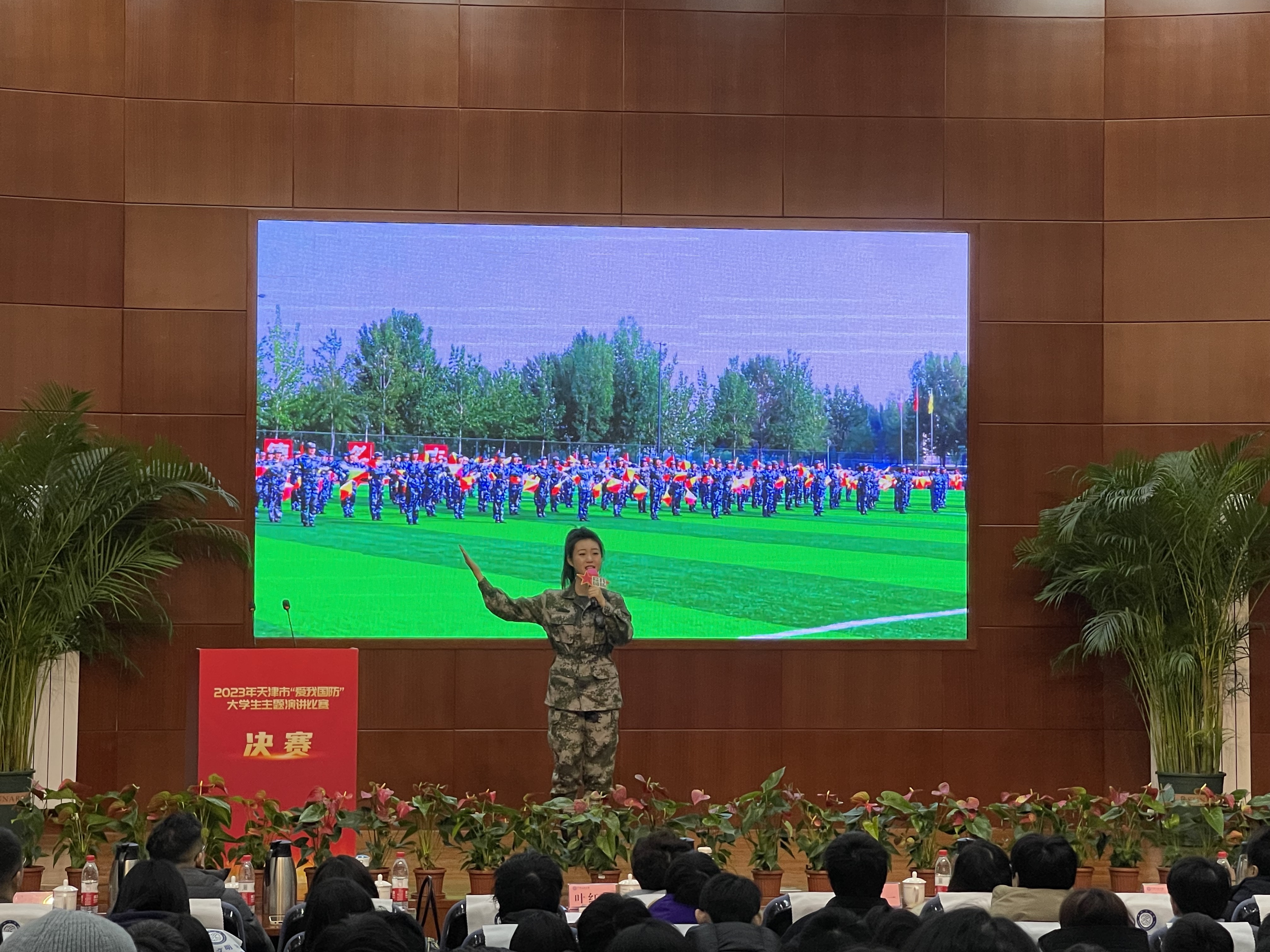2023年天津市大学生“爱我国防”主题演讲比赛自今年6月开赛以来,全市各高校组织各级选拔赛765场,1万余人参赛,经过激烈角逐,来自15所高校的15名学生晋级决赛。韩语轩同学历经选拔赛初赛和决赛的层层筛选,凭借优异表现脱颖而出,进入全市最终决赛。决赛中韩语轩同学以我院学生教导队退役复学教官陈宗德“守卫中印边疆”和贾轻松“任歼-16模拟机机长”的故事为主线,用满怀深情的语言和真挚的爱国情感抒发报效祖国的豪情壮志。在随机抽题即兴演讲过程中,她更是声情并茂的讲述了 “时代楷模”黄文秀担当使命的感人事迹。