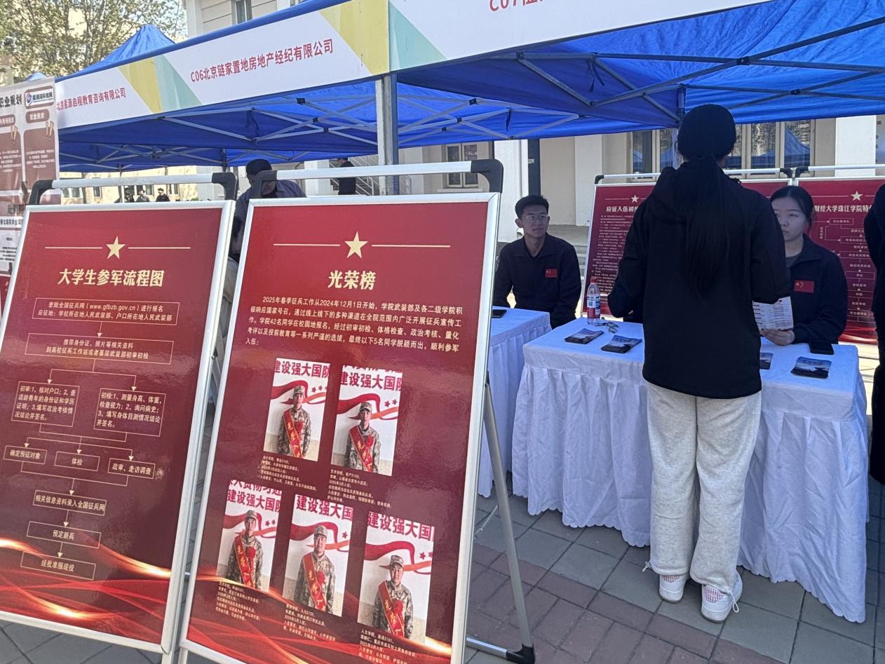 4月10日,学院素质教育中心广场上,一场以"青春向军营 热血铸荣光"为主题的征兵宣讲活动,依托2025年校园双选会火热开展。武装部采用"国防+就业"融合模式,通过政策全景解读、军旅故事分享两大板块,为怀揣报国志向的2021级学子描绘出立体化的强军成才图景。