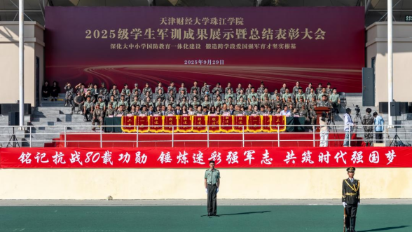 院长任碧云教授作题为《弘扬军训精神 磨砺青春意志》军训总结报告。她代表学院欢迎领导、来宾和家长朋友们出席军训成果展示暨总结表彰大会,祝贺2025级同学们顺利完成了大学的第一堂必修课,感谢天津市委宣传部、天津市教委、宝坻区人武部、宝坻区教育局对学院国防教育事业给予的支持和帮助,对帮训部队官兵和学生教导队承训教官的辛苦付出给予高度赞扬。她对精彩纷呈、卓有成效的军训成果感到欣慰和喜悦,为同学们展示出的军事素养和精神面貌感到骄傲和自豪。她希望同学们在书山学海中,以站军姿的恒心攻克难题;在人生征途上,以踢正步的坚定迈向理想;在时代洪流里,将“勤学善思”化为个人智慧,以“厚德笃志”成就集体荣光。在纪念中国人民抗日战争暨世界反法西斯战争胜利80周年、喜迎中华人民共和国76周年华诞的重要时刻,任院长提出:一、向军人的好品格致敬,把他们的优良作风传承下去。希望同学们学习军人能吃苦、肯奋斗、爱国家、敢拼搏的好品质,继续努力、追求更好,把军训时养成的好习惯和锻炼出的坚强意志用到以后的学习生活里,时刻展现新时代大学生有活力、肯向上的好风貌。二、向伟大的祖国致敬,在心里深深种下爱国的情感。希望同学们把爱国变成自己一辈子的底色,遵守学校规定、爱护校园,尊重老师、关心同学,孝顺父母、真诚待人,努力学习、练强本领,分清对错、传播正能量,争取成长成能担起民族复兴重任的有用人才。三、向美好的青春致敬,永远保持忠诚的初心。希望同学们坚定自己的信念、珍惜宝贵的时光,记住学习的初衷、练就过硬的本领、打造更优秀的自己,把青春的理想种在民族复兴的土地上,把奋斗的脚印留在建设社会主义现代化强国的路上,努力做热爱祖国、立志报国、踏实做事的新时代青年,用军人般的坚强、青春的热情为伟大的祖国献礼。