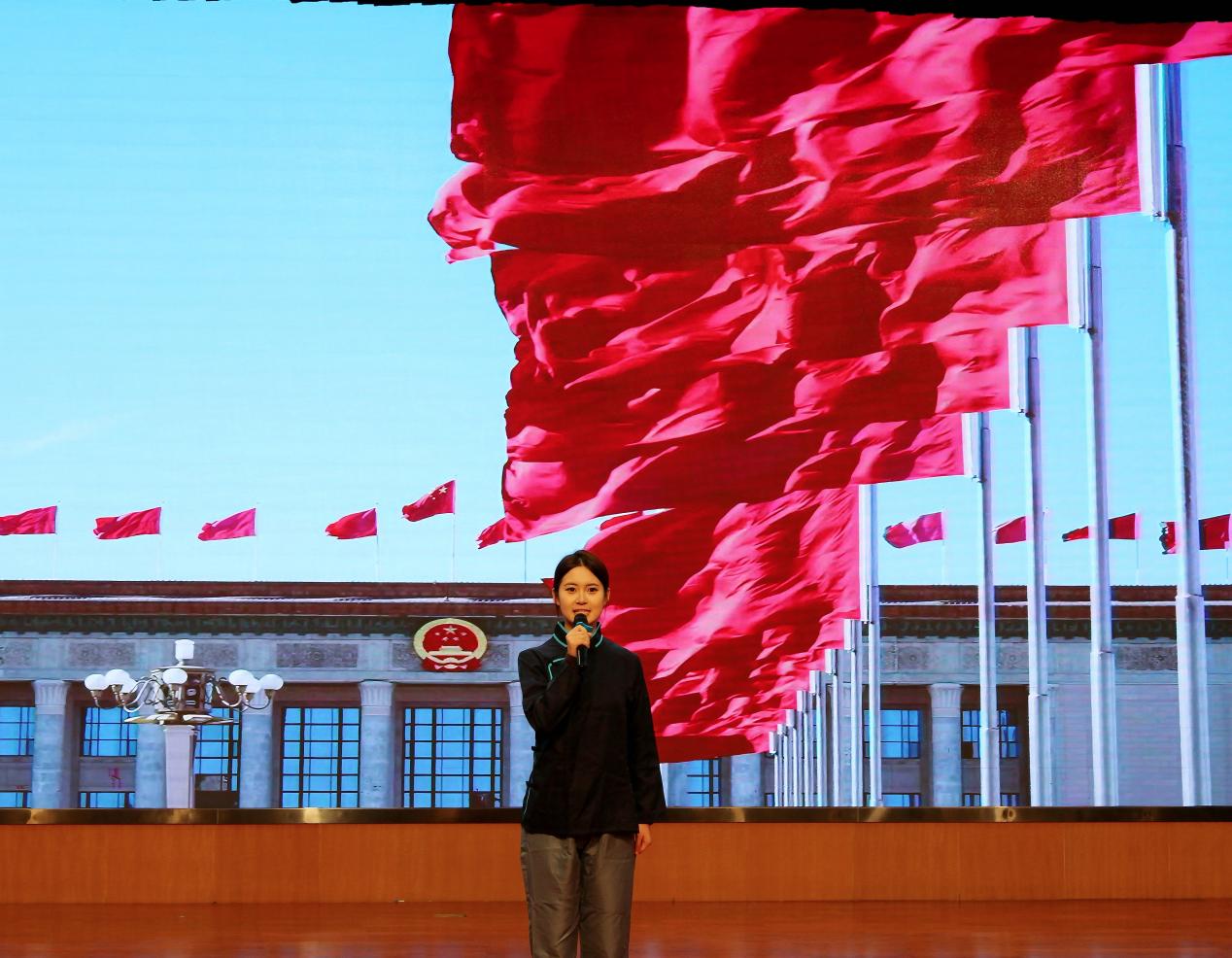 展演现场,各学院代表队倾情演绎,呈现了一幕幕感人至深的历史片段。艺术学院《家国回响:抗战记忆诵》生动再现了冀中军民地道战的智慧与坚韧;数据工程学院《炬火照山河》激昂展现了1919年爱国青年“以笔为刃”的热血激情;大学生军人服务中心陶怡然同学的朗诵《黑土地上的呐喊》,以731部队罪行的历史铁证发出“铭记真相、捍卫和平”的时代强音。