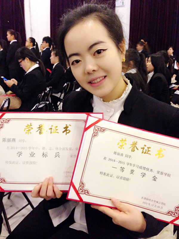 大二期间,陈丽燕当选为艺术学院学生会副主席,这锻炼了她的组织能力和实践能力,也让她从稚嫩走向成熟。辩论赛、篮球运动会、田径运动会、足球赛、音乐会讲座、团代会、学代会、每个月的九大主题教育系列活动......各种活动都有她忙碌的身影。在第二期骨干培训中,她担任8班的班长,带领同学们积极开展了各类素质教育活动,顺利拿到了“结业证书”,并被评为“优秀学员”。同时,她是班里第一批入党积极分子,并取得入党结业证书,曾获得学院优秀学生干部、学院优秀共青团员、天津市每日新报杯入围奖、第十三届中国大学生广告艺术节学院奖佳作奖,获得一等奖学金,单科奖学金,二等助学金、国家励志奖学金。