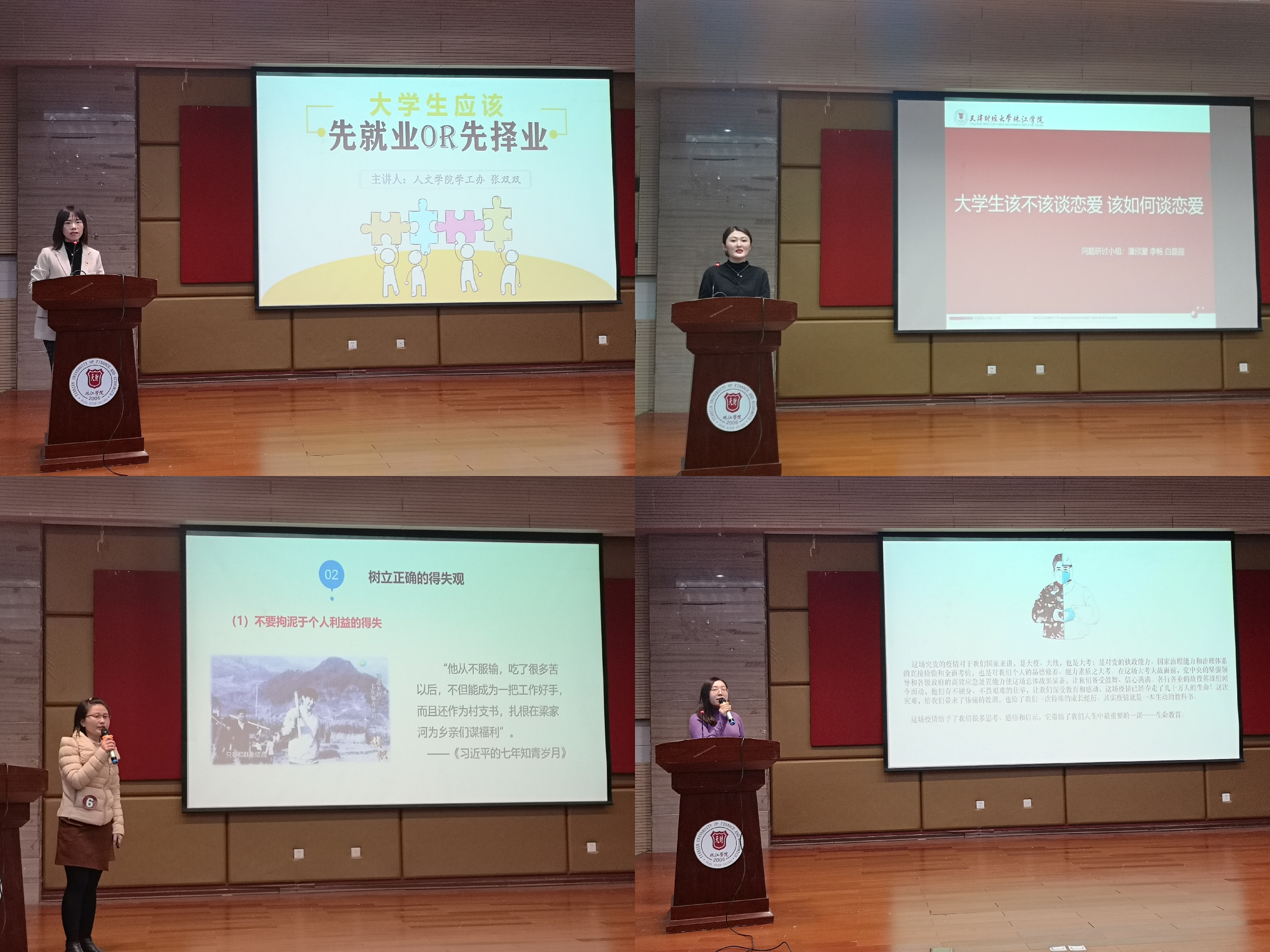 本次活动以解答2020年天津市高校学生思想政治教育部分疑难问题为主要内容。10位辅导员代表分别从党团教育、思想认识、就业创业、心理困惑四个方面进行演讲。其中陈绍生老师对大学生就业思考和潘欣蕾老师对大学生恋爱问题的解答言简意赅、逻辑严密,数据详实,贴近大学生实际,给在场老师留下深刻印象。