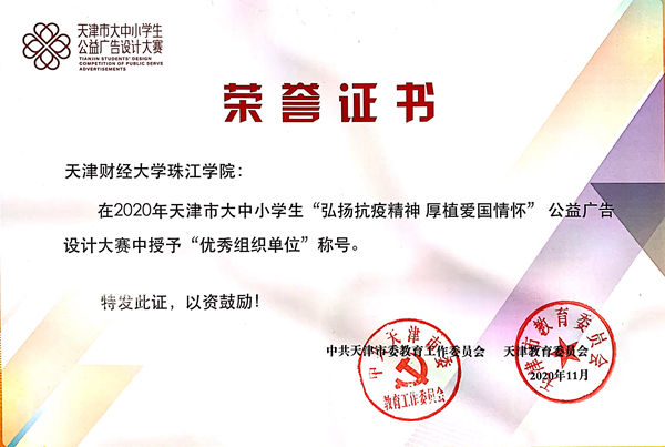 近日,2020年天津市大中小学生“弘扬抗疫精神 厚植爱国情怀”公益广告设计大赛圆满落幕。我院人文学院广告1806班李斯佳同学创作的《你好 中国就好》和杜广昊同学创作的《隔离》荣获优秀奖,我院荣获“优秀组织单位”称号。