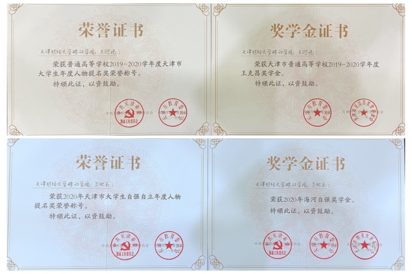 王迎悦和兰欣玉分别获得王克昌奖学金和2020海河自强奖学金