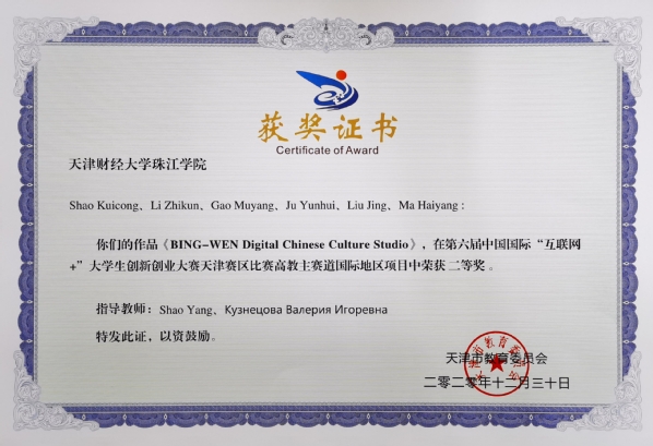 中国国际“互联网+”大学生创新创业大赛是覆盖全国所有高校、面向全体大学生、影响最大的创新创业类赛事活动。本届大赛中,荣获国际赛道天津市二等奖的《BIN-WEN Digital Chinese Culture Studio》,为我校与莫斯科国立大学联合开展的创业项目,也是本届大赛我市同类院校唯一获此级别奖项的项目。