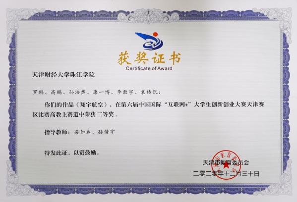马海洋等同学参与的项目《BIN-WEN Digital Chinese Culture Studio》(邵阳老师指导)荣获国际赛道天津市二等奖;罗鹏等同学参与的项目《翔宇航空》(梁如春等老师指导)、叶嘉隆等同学参与的项目《伴·学》(张鹏老师指导)荣获主赛道天津市二等奖。