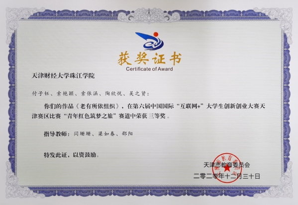 罗雅琦等同学参与的项目《衔蝉录》(梁如春等老师指导)、郭佳兴同学参与的项目《e品津味网》(余耀东老师指导)、王转等同学参与的项目《易摊信息服务APP》(余耀东老师指导)、杨若童等同学参与的项目《康寿医诊》(刘金岭老师指导)、刘文杰等同学参与的项目《博创机器人创意培训中心》(闫珊珊等老师指导),荣获主赛道天津市三等奖;付子钰等同学参与的项目《老有所依组织》荣获“青年红色筑梦之旅”赛道天津市三等奖。