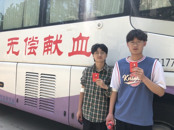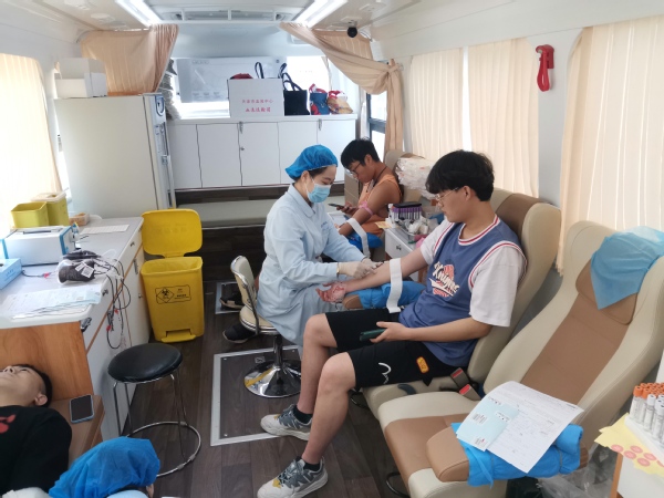 虽然天气炎热,但学生参与活动的热情只增不减,最早的学生们7:00就在长廊前排起了长队等候献血车的到来。红十字会的志愿者们听从指挥,积极配合医护人员服务献血活动。准备献血、出示有效证件、填写《无偿献血登记表》、物理查体、血型和快速化验材料、采集血液、领取献血证及纪念品,各项环节流畅开展,秩序井然。