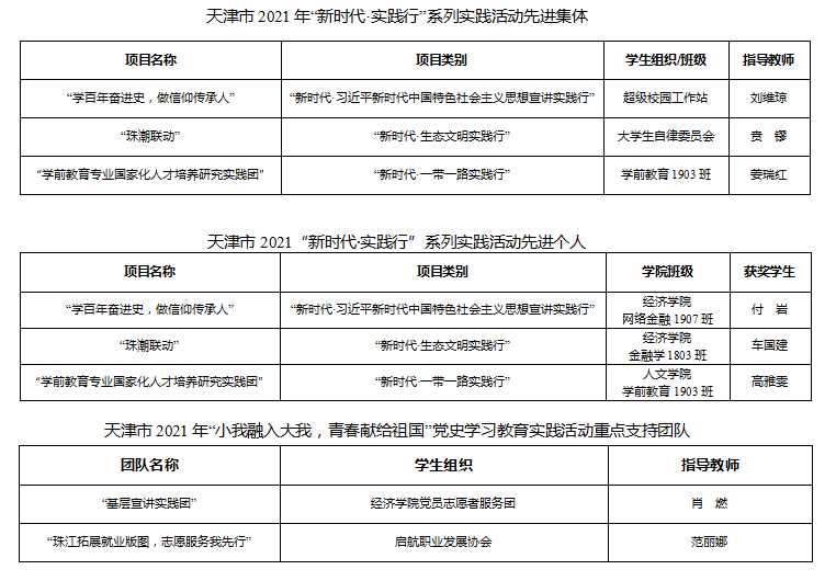 近日,天津市2021年“新时代·实践行”系列实践活动和天津市2021年“小我融入大我,青春献给祖国”党史学习教育实践活动终审落下帷幕。我院共有三支团队获评“新时代·实践行”先进集体,三名同学获评“新时代·实践行”先进个人。两支团队获评党史学习教育实践活动重点支持团队。
