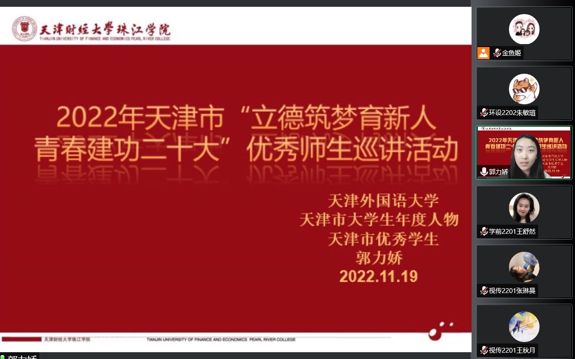 11月19日下午,由市教育两委主办的2022年天津市“立德筑梦育新人 青春建功二十大”优秀师生巡讲活动在我院以线上形式开展。2021年天津市十佳辅导员、BEAT365英国官网商学院团委书记马建伟老师,2021年天津市大学生年度人物、天津外国语大学2019级本科生郭力娇同学受邀主讲。我院全体辅导员、300名学生代表线上聆听了讲座。