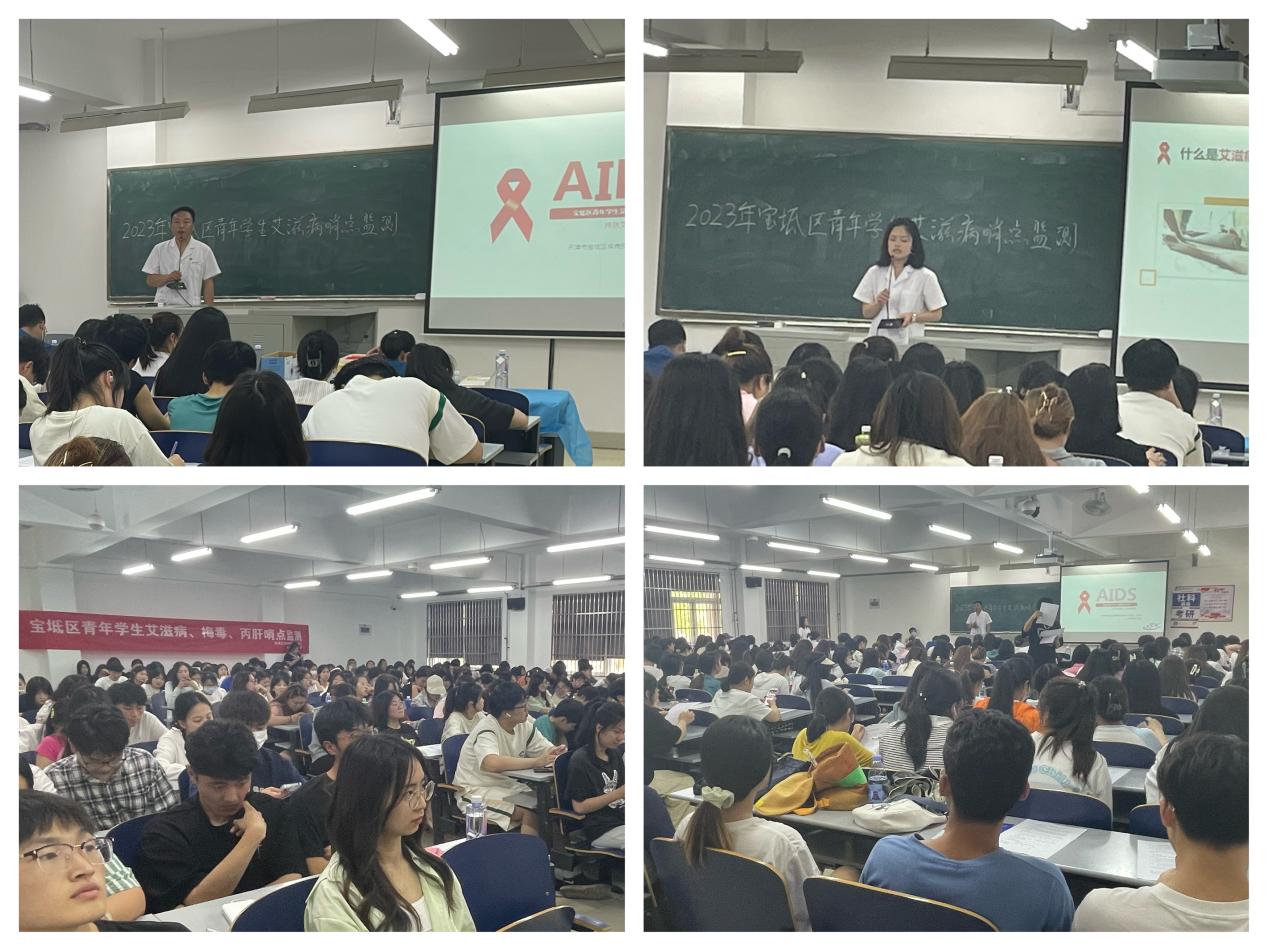 我院作为天津市宝坻区艾滋病哨点监测院校,于6月14与宝坻区疾病预防控制中心联合举办了预防艾滋病宣传以及哨点监测活动。本次活动特邀宝坻疾控中心刘春长科长以及纪玉环医生担任主讲人,在教学楼日新104举办,共400多名同学参与。