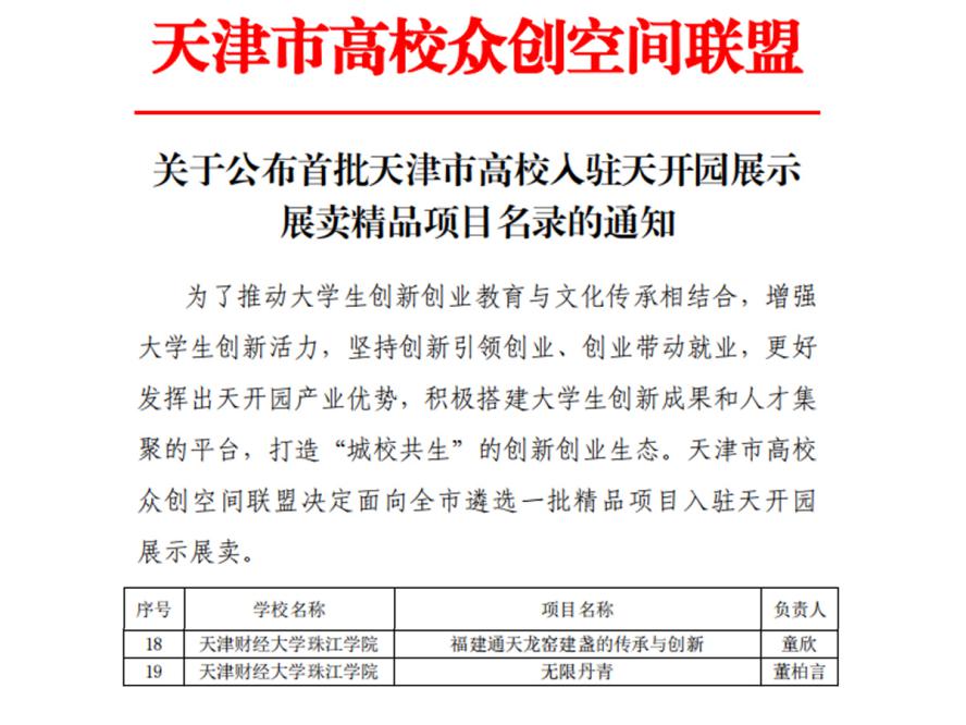 近日,天津电视台新闻频道专题节目——《“十项行动”见行见效》对学院2023年大创团队走进天开高教科创园交流学访活动进行报道。其中由艺术学院董柏言同学主持的《无限丹青》项目和经济学院童欣同学主持的《福建通天龙窑建盏的传承与创新》项目,同时获批首批天津市高校入驻天开园展示展卖精品项目。各二级学院分管创新创业的辅导员老师参加了此次活动。