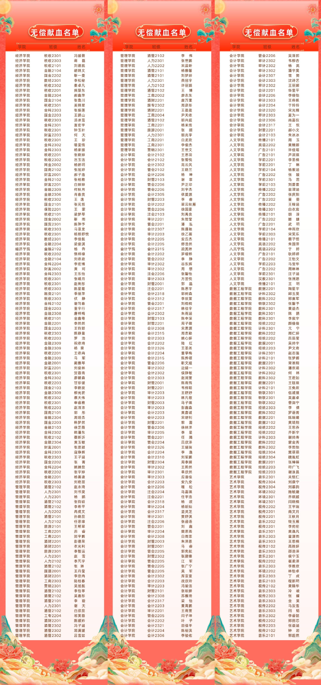 2023年秋季学期我院学生累计献血99400毫升,参与学生354人,其中经济学院87人,管理学院51人,会计学院115人,人文学院30人,数据工程学院38人,艺术学院33人。学院红十字会干事也参加无偿献血现场工作,维持秩序,配合血液中心工作人员完成相关工作。