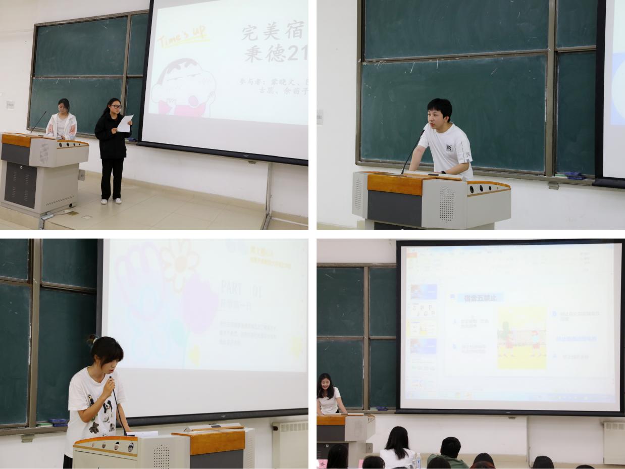 本次比赛共有20支参赛队伍,参赛队伍依次上台进行PPT展示,展示结束后由评委对每间宿舍的表现进行现场评分,排名前10名的宿舍被评选为“十佳文明宿舍”。