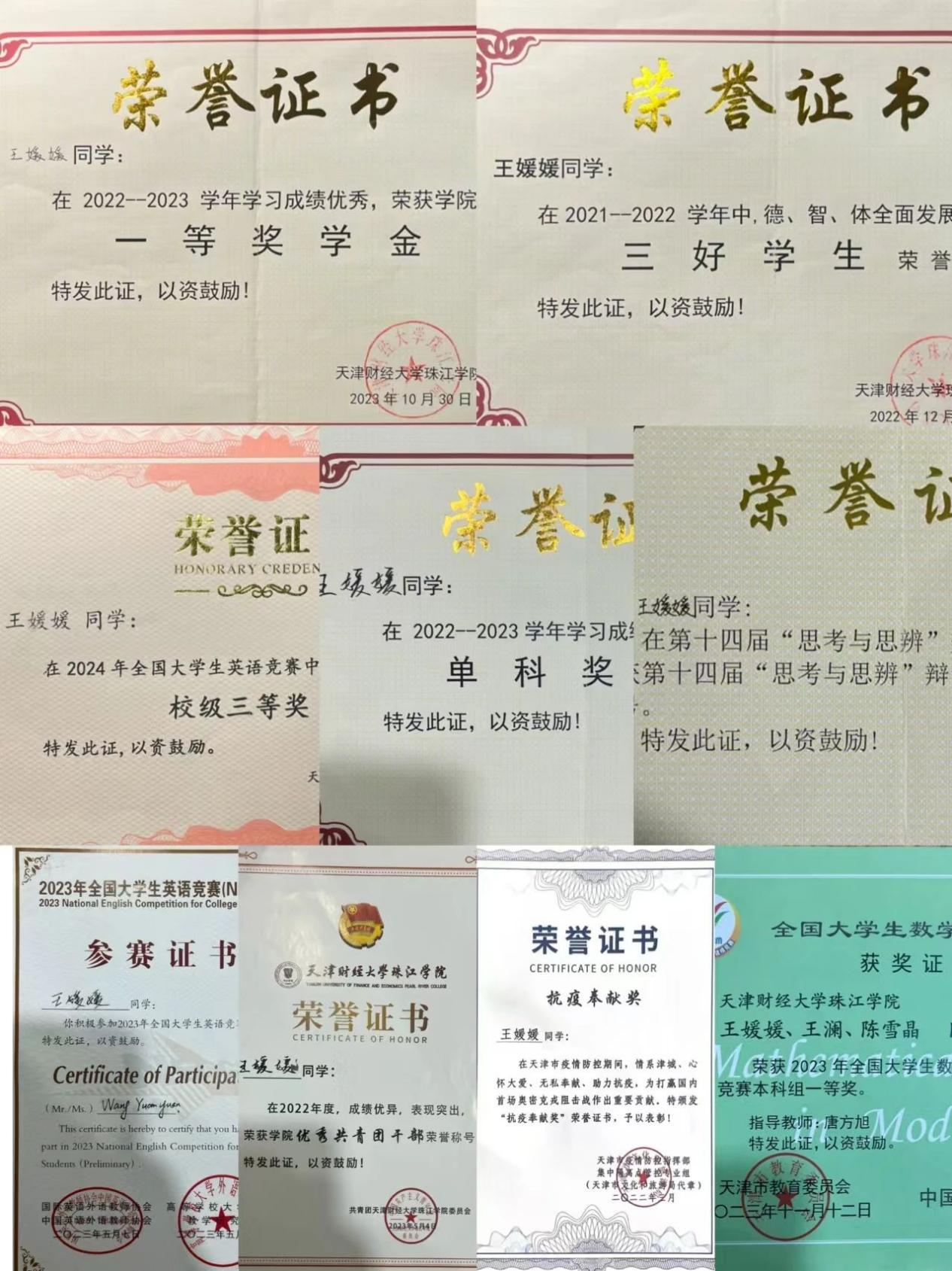 在学习方面,王媛媛同学一直保持着勤奋好学的态度,连续三年以专业第一名的成绩荣获一等奖学金及单科奖学金,并获得三好学生、优秀共青团干部等荣誉称号。此外,她还积极参与各类竞赛和活动,不断提升自己的专业素养。在全国数学建模大赛中,她荣获一等奖,在中国国际创新大赛中获得了天津市三等奖的好成绩。同时,她也顺利取得初级会计证书、四六级证书等,并通过了银行从业资格考试。