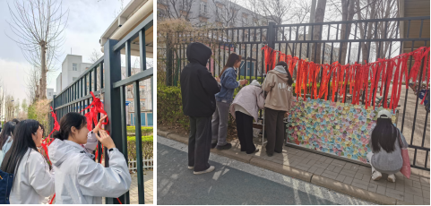 活动现场,同学们纷纷在精心准备的彩色标签纸上写下自己在宿舍生活中的温暖故事、对室友的感谢以及对未来的美好祝愿。“感谢室友在我生病时的细心照顾”“XX宿舍的宝子们超级好”“愿我们毕业时仍能保持这份真挚的友情”“愿考研顺利、前程似锦”等等……一条条真挚的留言贴满了展板,传递着同窗情谊的温暖与感动,传达对家人、对朋友的爱与祝福。此外,活动还设置了“书写并悬挂祈福带”环节,同学们可以亲手将自己的美好祝福与心愿写在祈福带上,悬挂在特意准备的绳子上,让一条条寓意着喜气与祝愿的红带随风飘扬,形成了园区内一道独特的风景线,鼓舞激励着来往的学生们。