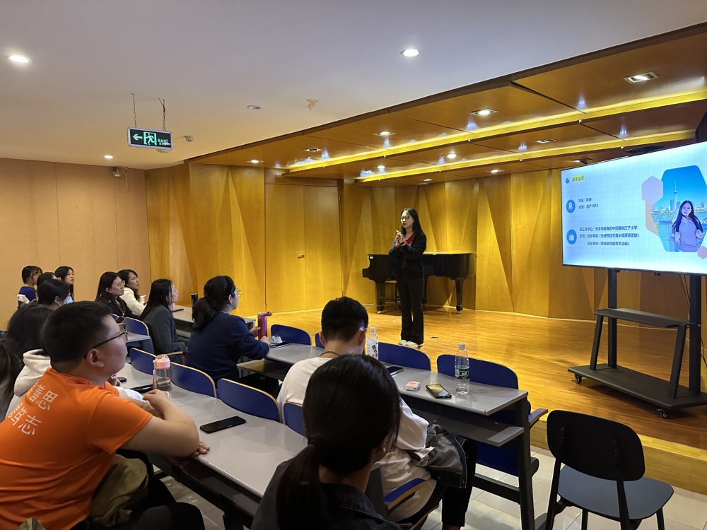 紧接着分享的是就职于天津市静海区小学的音乐教师陈静同学。她以自己为例分享了她在天津市考编的心路历程,重点介绍了对考编信息及时关注的重要性,以及笔试面试的前期如何准备及注意事项。陈静同学的分享为大家解开了很多困惑,让大家意识到了在校期间学习好专业课的重要性,更加明晰了在校期间如何为就业做好各方面的准备,从而更加从容地面对竞争激烈的就业市场环境。